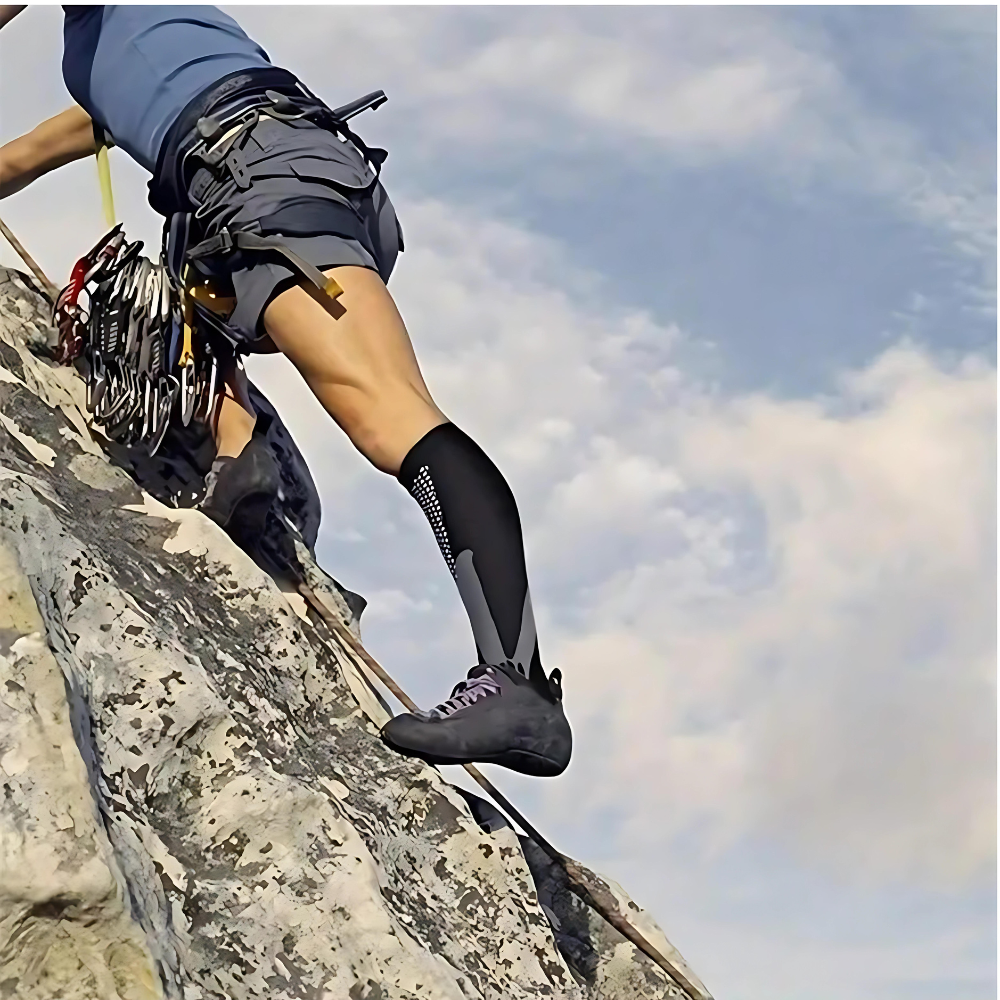 Kompressionssocken fördern den Blutfluss, indem sie einen sanften Druck auf die Beine ausüben, der hilft, Blut zurück zum Herzen zu leiten und Schwellungen zu reduzieren.